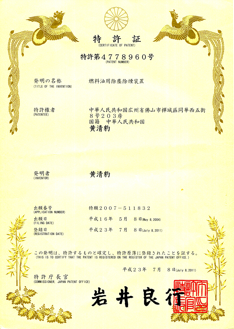 美國專利證書1:一種除燃油煙塵設(shè)備(人居-2011) 日本專利證書2:一種除燃油煙塵設(shè)備(人居-2011)