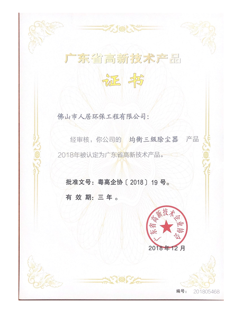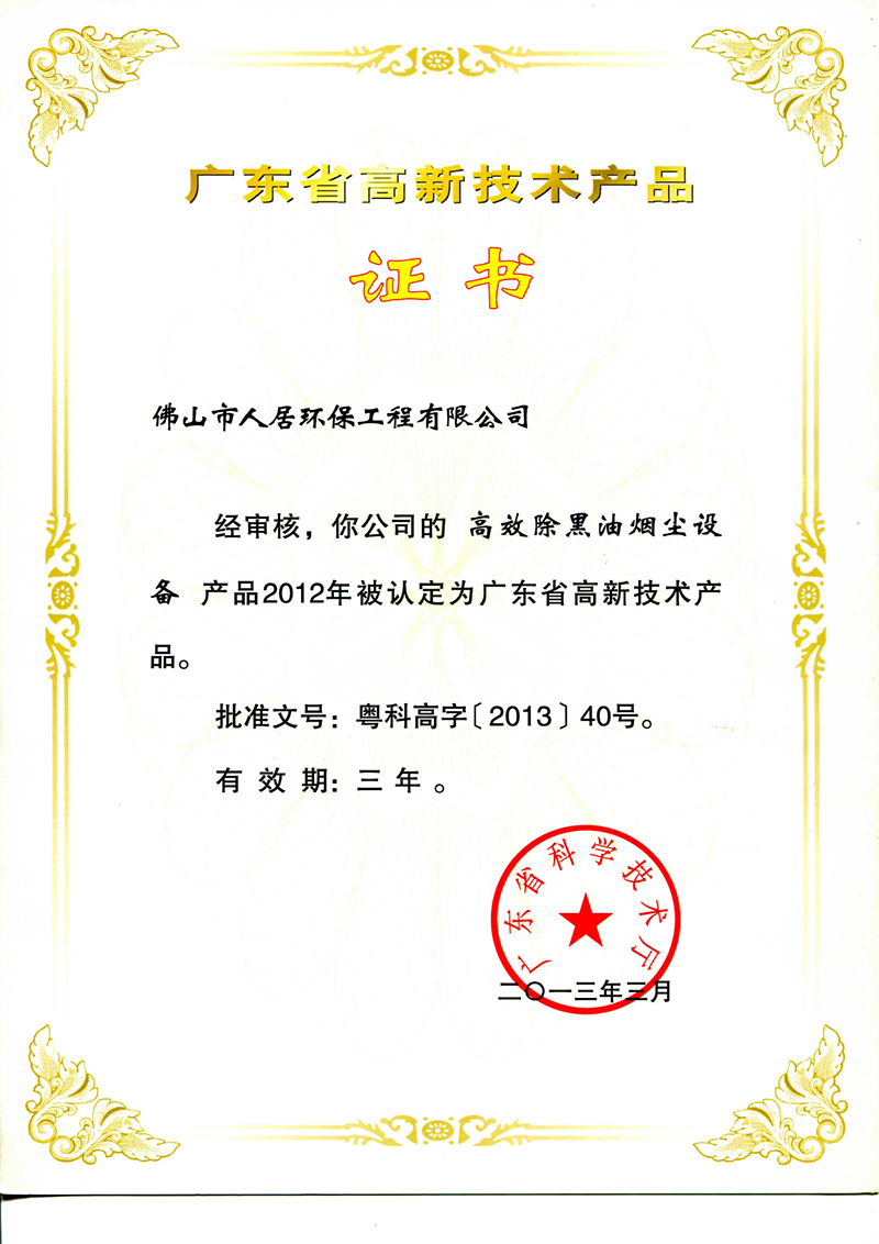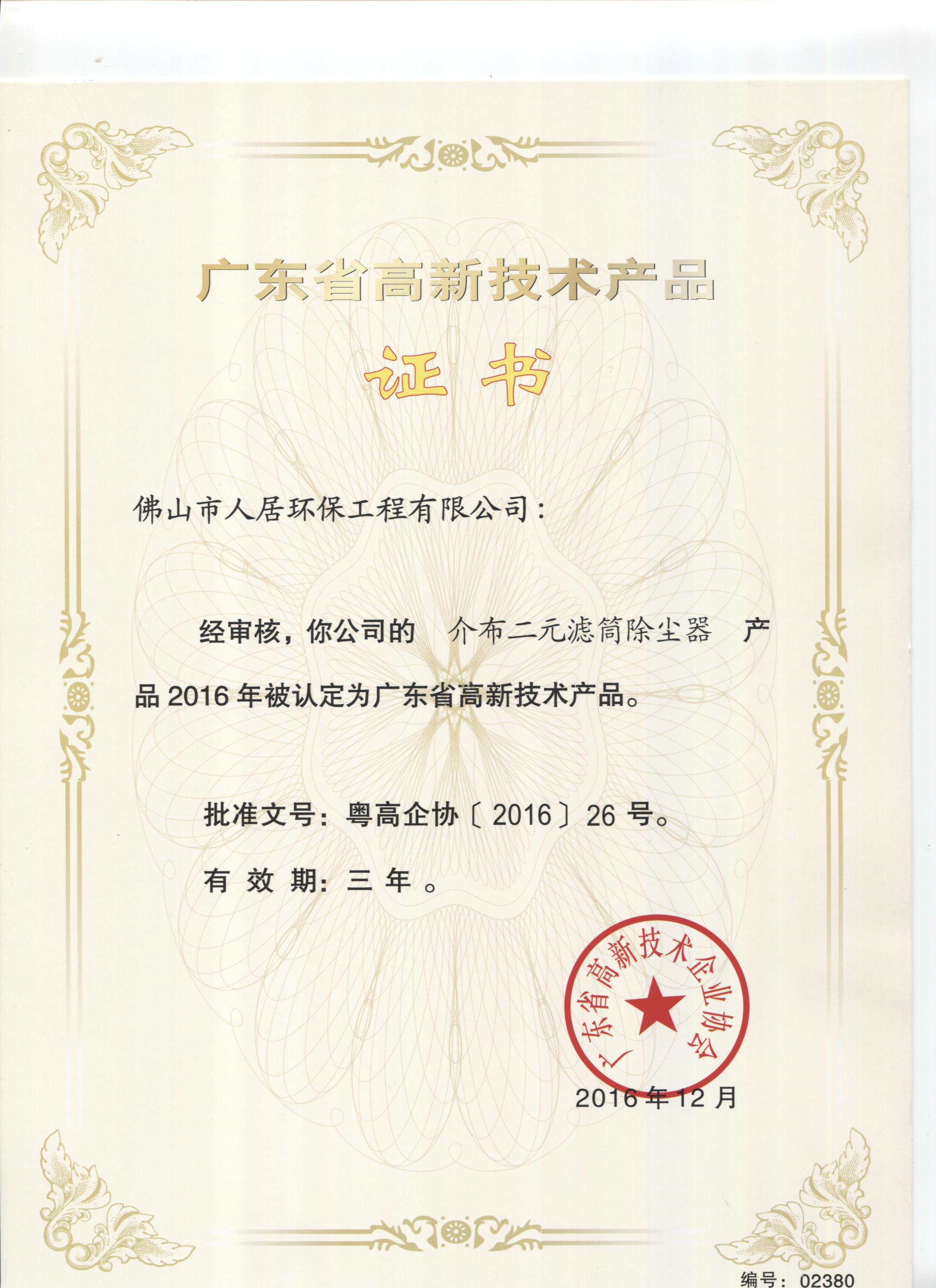 1 、高效除黑油煙塵設(shè)備高品證書 2 、介布二元除塵器高品證書
